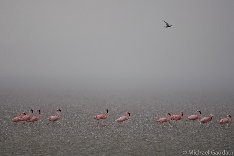 Flamingos unfazed by a heavy rain and low cloud on Lake Nakuru.