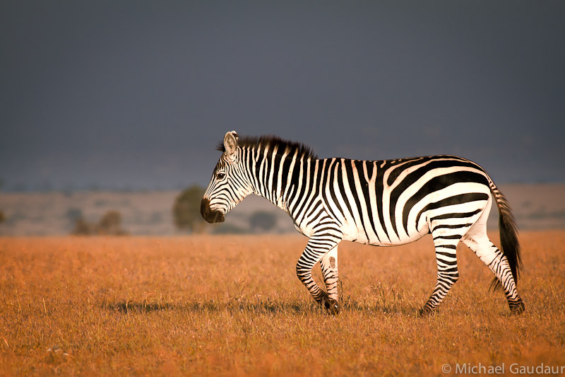 The early morning sun skimmed across the short grass from behind this zebra as a storm was brewing in the distance. It is hard to beat the dramatic light that accompanies the rains down in Africa. Swara Plains Ranch, Kenya.